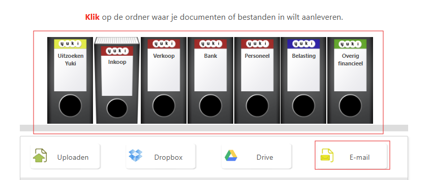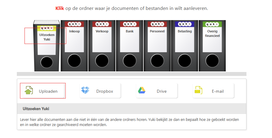 Bij deze optie gaan we uit dat documenten (facturen en bonnen) al (gescand) en bewaard zijn in een map op je laptop of pc. Via de Postbus in Yuki is het mogelijk om meerdere documenten (tot max. 30 mb) up te loaden.