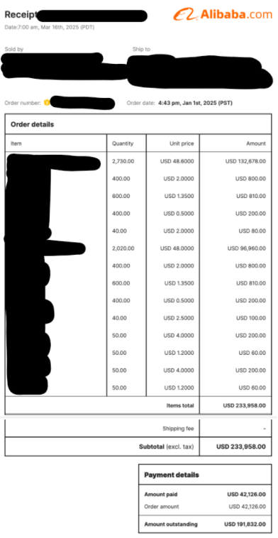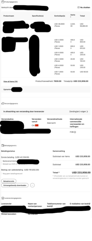 In het geval dat de inkoop via Alibaba is gegaan, hebben we het besteloverzicht (order details) en het betaalbewijs (payment receipts) nodig.