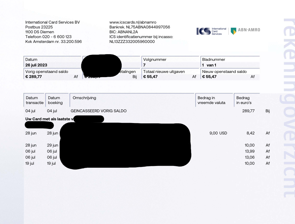 Van de ABN AMRO creditcard hebben we de maandelijkse rekeningoverzicht nodig. Er is een pdf-bestand beschikbaar.